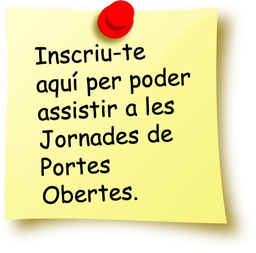 Els dies 16 d'abril i 7 de maig de 2026, a les 18:30 h, organitzem Jornades de Portes Obertes perquè vinguis a conèixer el nostre projecte educatiu i les nostres instal·lacions. Es faran sessions informatives separades per a grau mitjà i per a grau superior. Degut a l'aforament limitat caldrà fer inscripció per poder assistir-hi i només podran venir dues persones com a màxim.